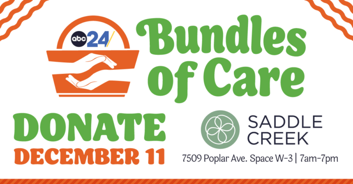 Bring your new items—blankets/throws, socks, toiletries, feminine hygiene products, diapers (adult and infant), and gloves/mittens—to Saddle Creek South on Wednesday, December 11, 2024, between 7AM and 7PM.