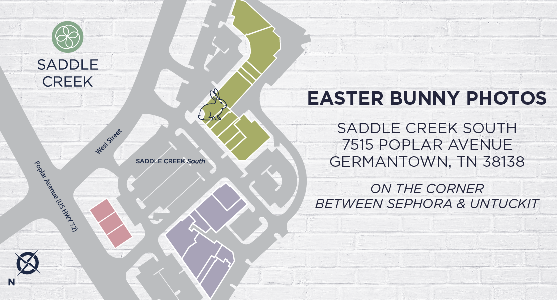 You’ll find the Easter Bunny at Saddle Creek South (7515 Poplar Avenue, Germantown, TN 38138), on the corner between Sephora and UNTUCKit.
